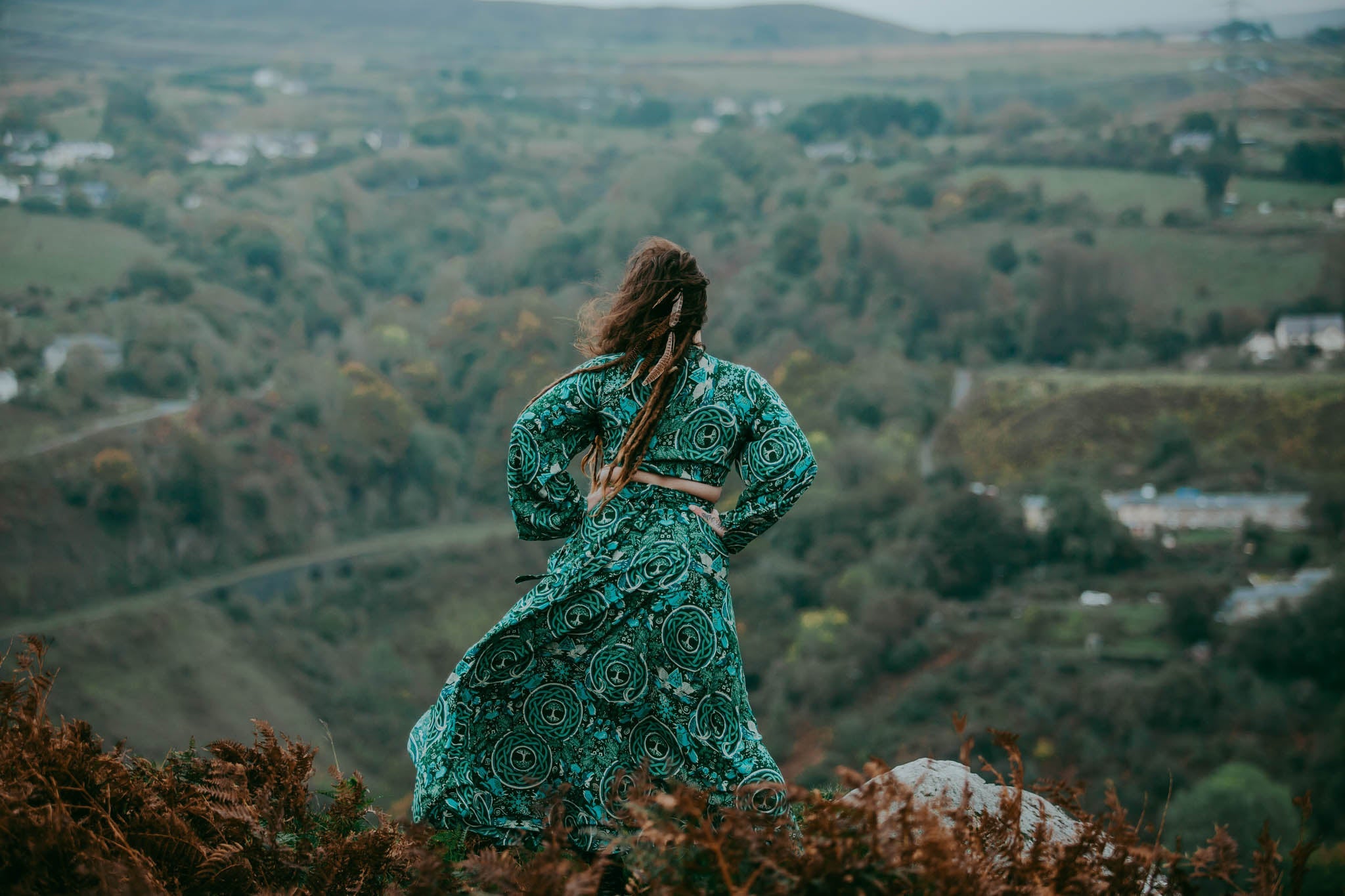 A symbol of women rising, reclaiming, and remembering! This captivating series features custom illustrations infused with symbolic mysticism and magical allure. Each garment is uniquely AE, blending boho aesthetics with unprecedented flair. Crafted from natural, soft fibers for year-round comfort, these pieces evoke the powerful energy of the Shield Maiden, summoning the inner warrior. Inspired by Norse colors and imagery intertwined with Celtic designs, it's the ideal modern adaptation.